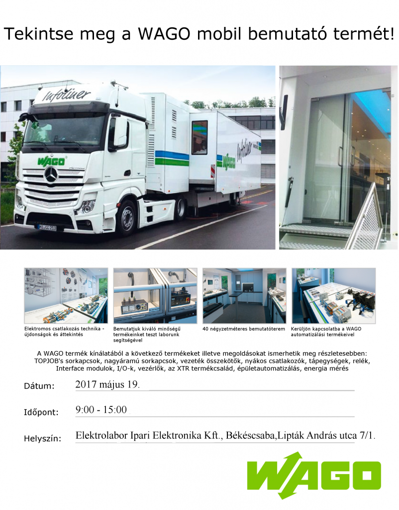 Bemutató busz Magyarországon ELEKTROLABOR KFT. 2018. ÁPRILIS 17. békéscsaba Április 4-én ismét Magyarországra érkezik a Phoenix Contact bemutató kisbusza az Infoliner, amellyel 2 hétig járjuk majd az országot, hogy különböző helyszíneken testközelből is bemutathassuk újdonságainkat. Egy valós gépgyártási példán keresztül az alábbi területekről tudhatsz meg többet: 2018 legújabb digitalizációs technológiái A legmodernebb kommunikációs