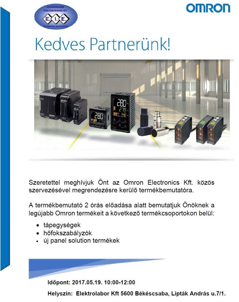 2018.05.24. csütörtök 10:00-12:30-ig Kedves Partnerünk! Szeretettel meghívjuk Önt az Omron Electronics Kft. közös szervezésével megrendezésre kerülő termékbemutatóra.A termékbemutató 1,5-2 órás előadása alatt bemutatjuk Önöknek a legújabb Omron termékeit a következő termékcsoportokon belül: • Az OMRON Új kódolvasó és kamerás családja• Motorfelügyeleti eszközök• Új hőmérséklet szabályozók• Kibővült új száloptikai erősítő eszközök• Új E2E induktív érzékelő család•